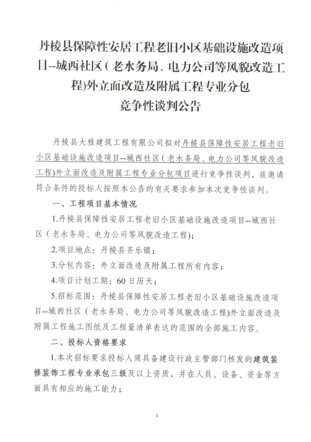 【大雅建筑公司】丹棱縣保障性安居工程老舊小區(qū)基礎設施改造項目--城西社區(qū)(老水務局、電力公司等風貌改造工程)外立面改造及附屬工程專業(yè)分包競爭性談判公告