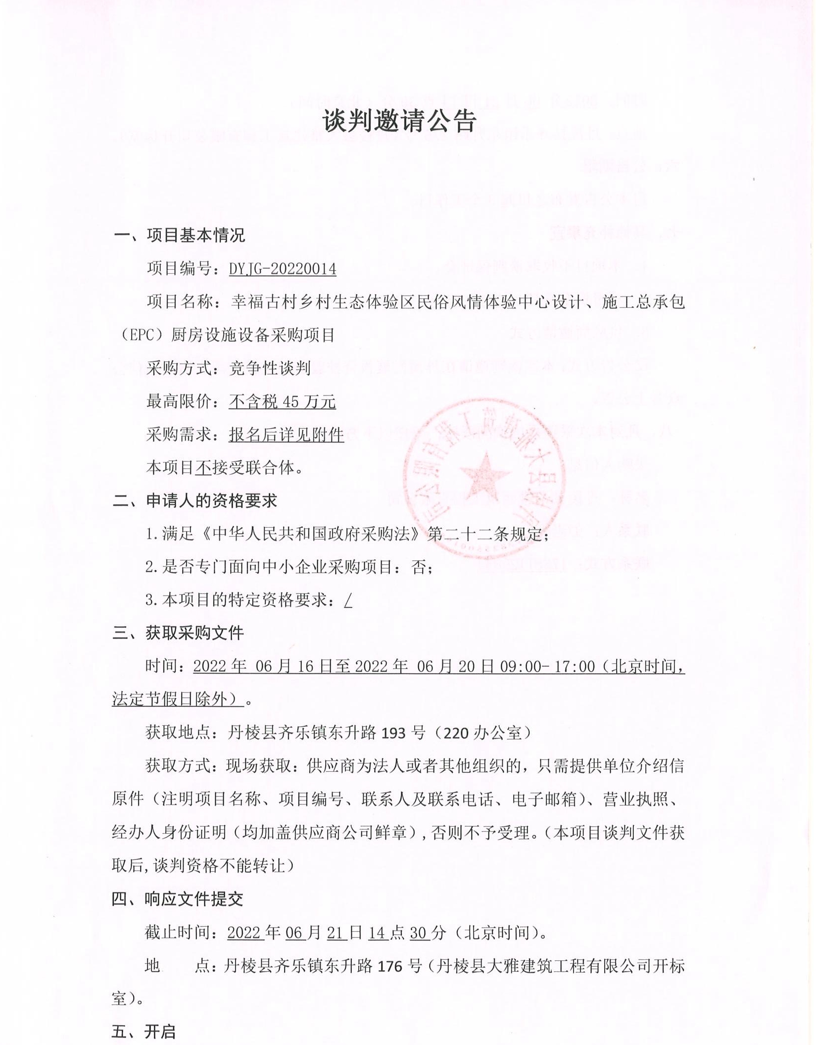 幸福古村鄉(xiāng)村生態(tài)體驗(yàn)區(qū)民俗風(fēng)情體驗(yàn)中心設(shè)計(jì)、施工總承包(EPC)廚房設(shè)施設(shè)備采購(gòu)項(xiàng)目談判邀請(qǐng)公告