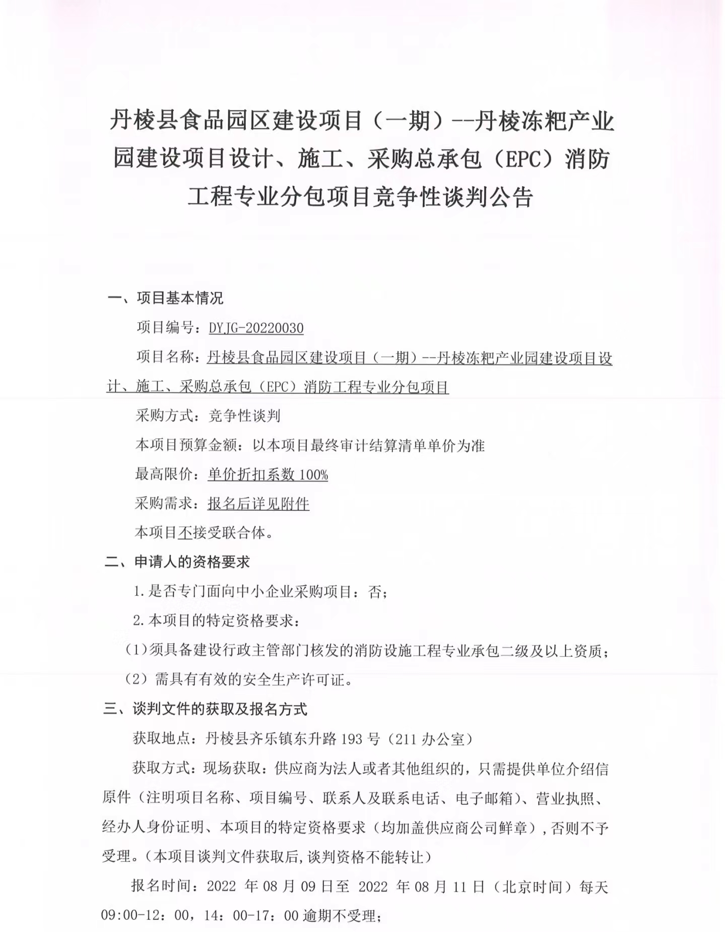 丹棱縣食品園區(qū)建設項目(一期)--丹棱凍粑產(chǎn)業(yè)園建設項目設計、施工、采購總承包(EPC)消防工程專業(yè)分包項目競爭性談判公告