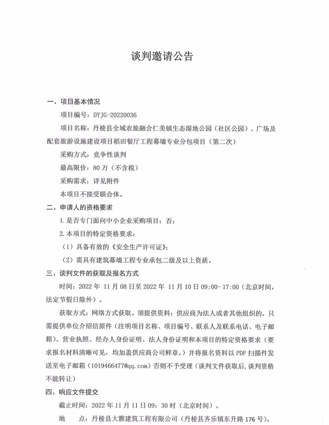 丹棱縣全域農(nóng)旅融合仁美鎮(zhèn)生態(tài)濕地公園(社區(qū)公園)、廣場及配套旅游設(shè)施建設(shè)項目稻田餐廳工程幕墻專業(yè)分包項目(第二次)談判邀請公告