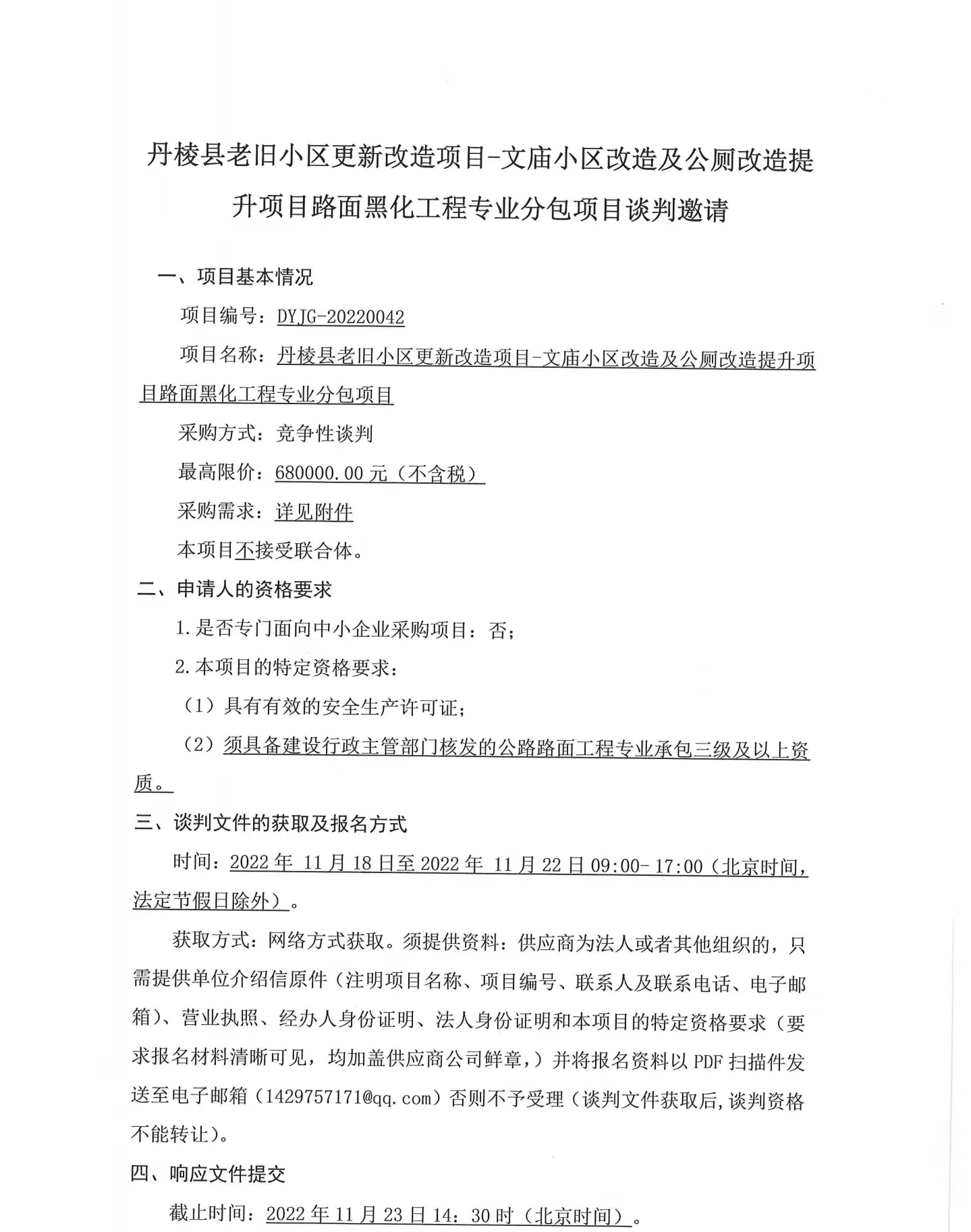 丹棱縣老舊小區(qū)更新改造項(xiàng)目-文廟小區(qū)改造及公廁改造提升項(xiàng)目路面黑化工程專業(yè)分包項(xiàng)目競爭性談判邀請(qǐng)公告
