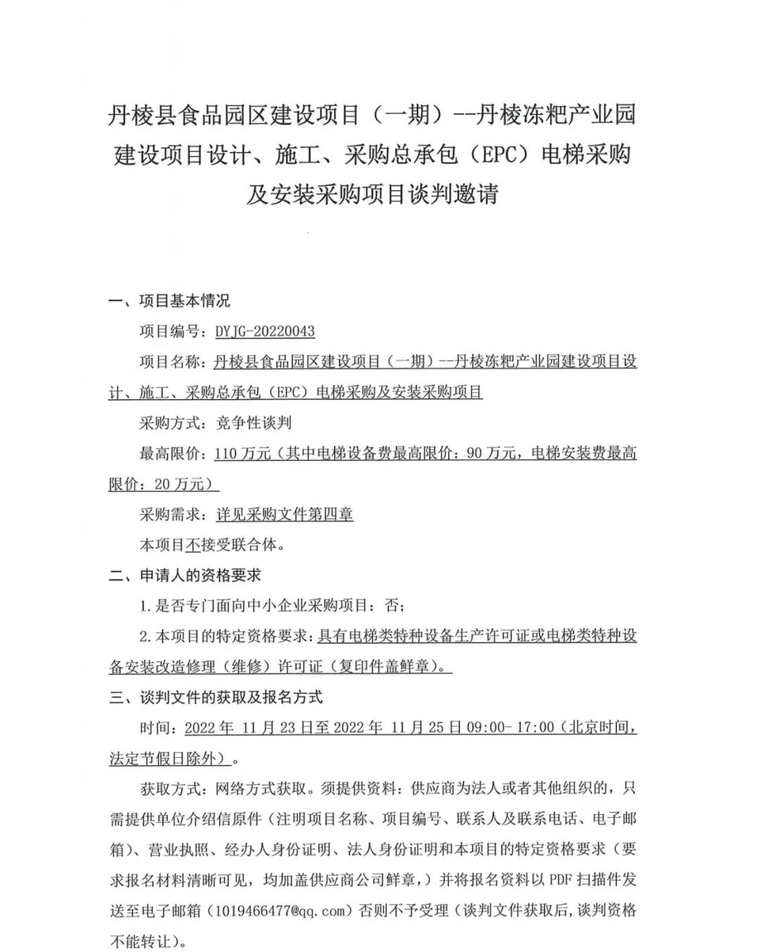 丹棱縣食品園區(qū)建設項目 (一期)--丹棱凍粑產(chǎn)業(yè)園建設項目設計、施工、采購總承包 (EPC) 電梯采購及安裝采購項目談判邀請公告