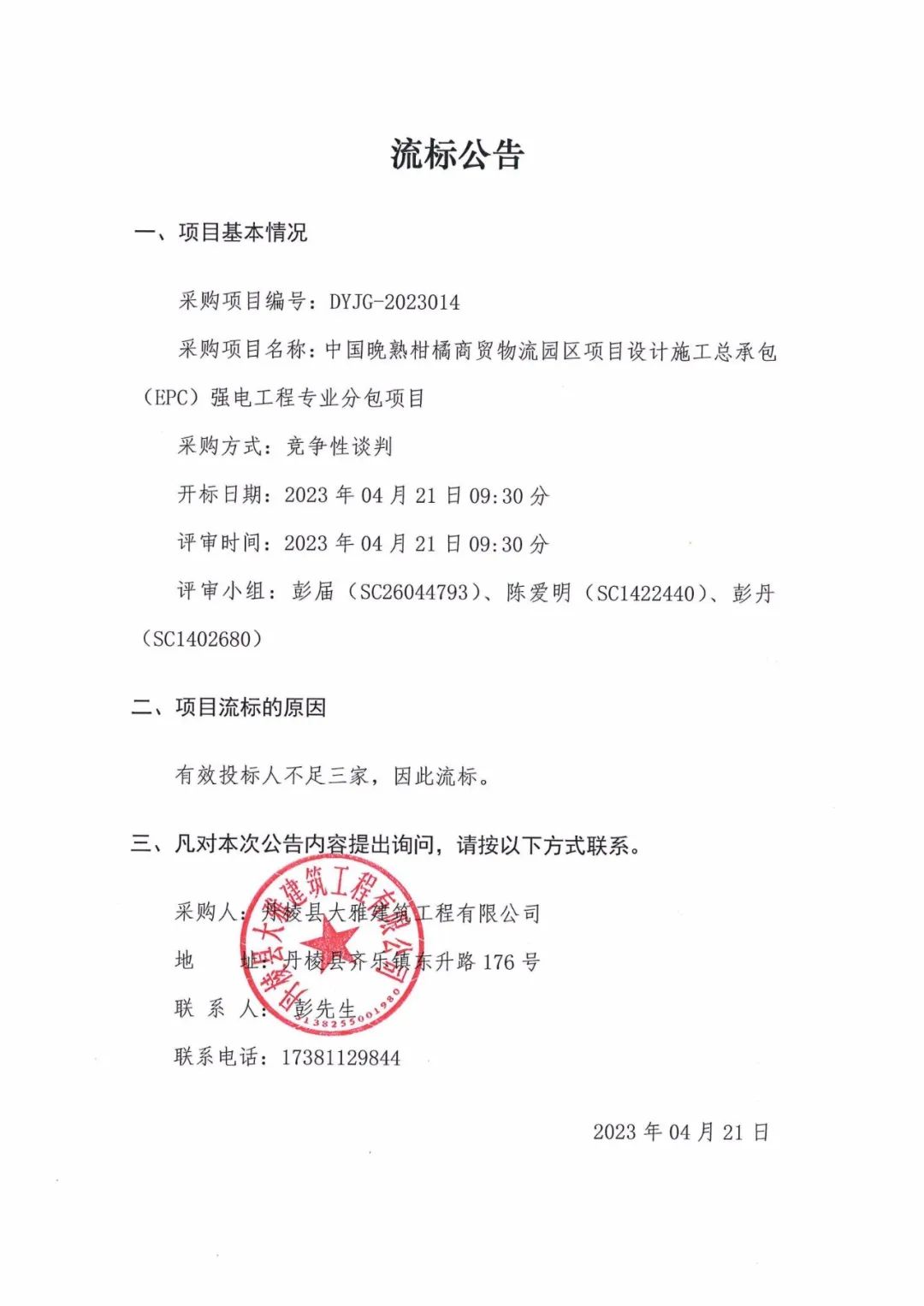 中國晚熟柑橘商貿(mào)物流園區(qū)項(xiàng)目設(shè)計(jì)施工總承包(EPC)強(qiáng)電工程專業(yè)分包項(xiàng)目流標(biāo)公告