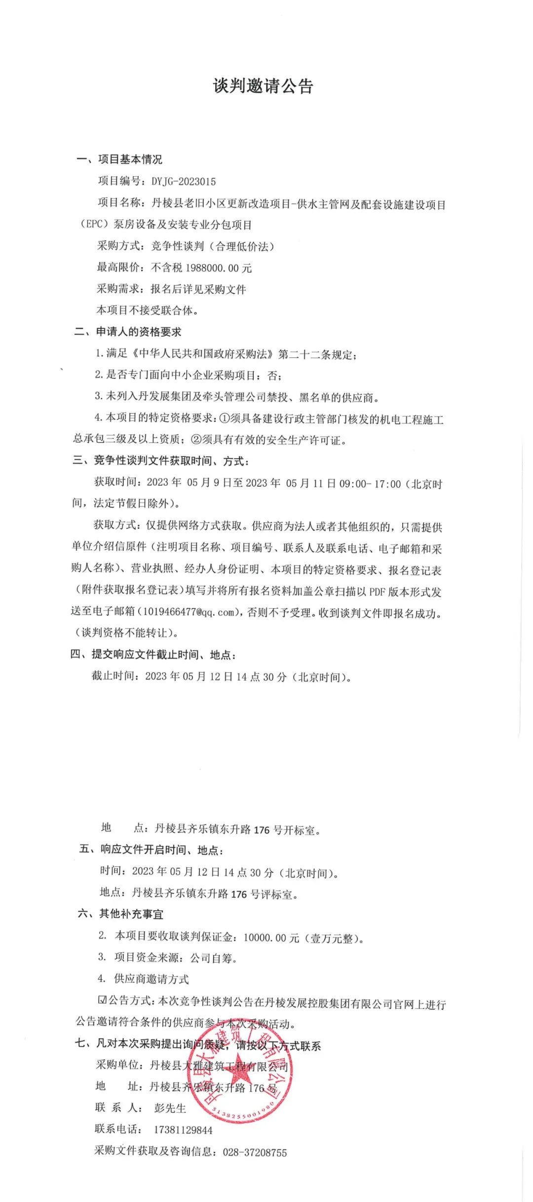 丹棱縣老舊小區(qū)更新改造項(xiàng)目-供水主管網(wǎng)及配套設(shè)施建設(shè)項(xiàng)目(EPC)泵房設(shè)備及安裝專業(yè)分包項(xiàng)目談判邀請公告
