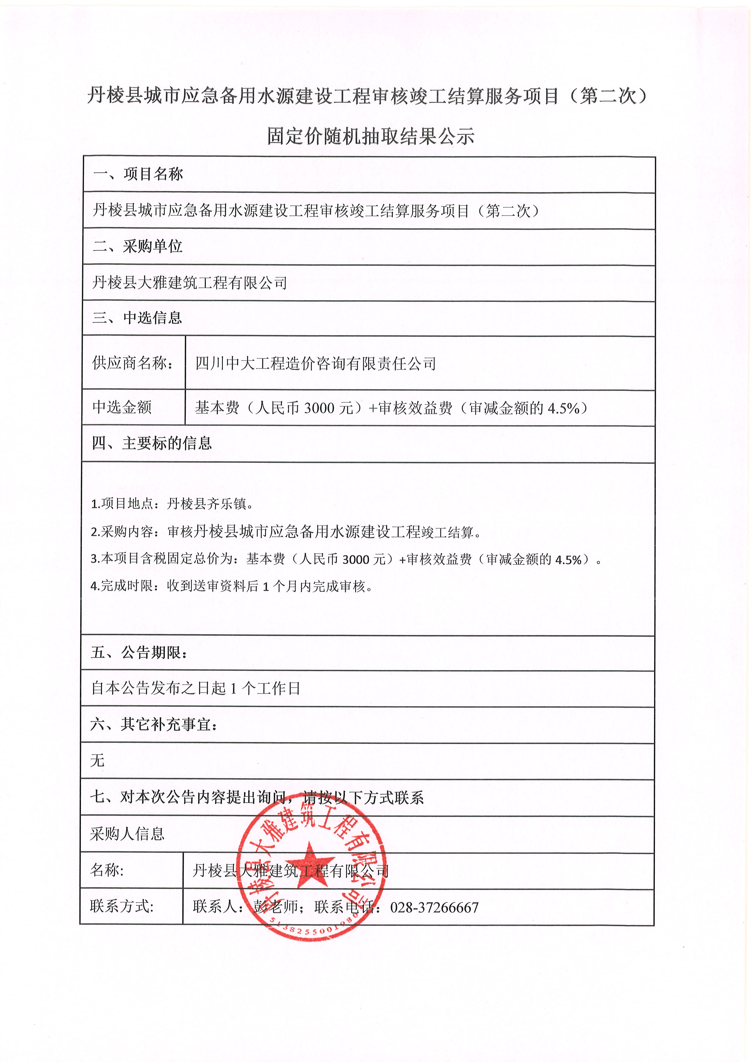 丹棱縣城市應(yīng)急備用水源建設(shè)工程審核竣工結(jié)算服務(wù)項目(第二次) 固定價隨機(jī)抽取結(jié)果公示