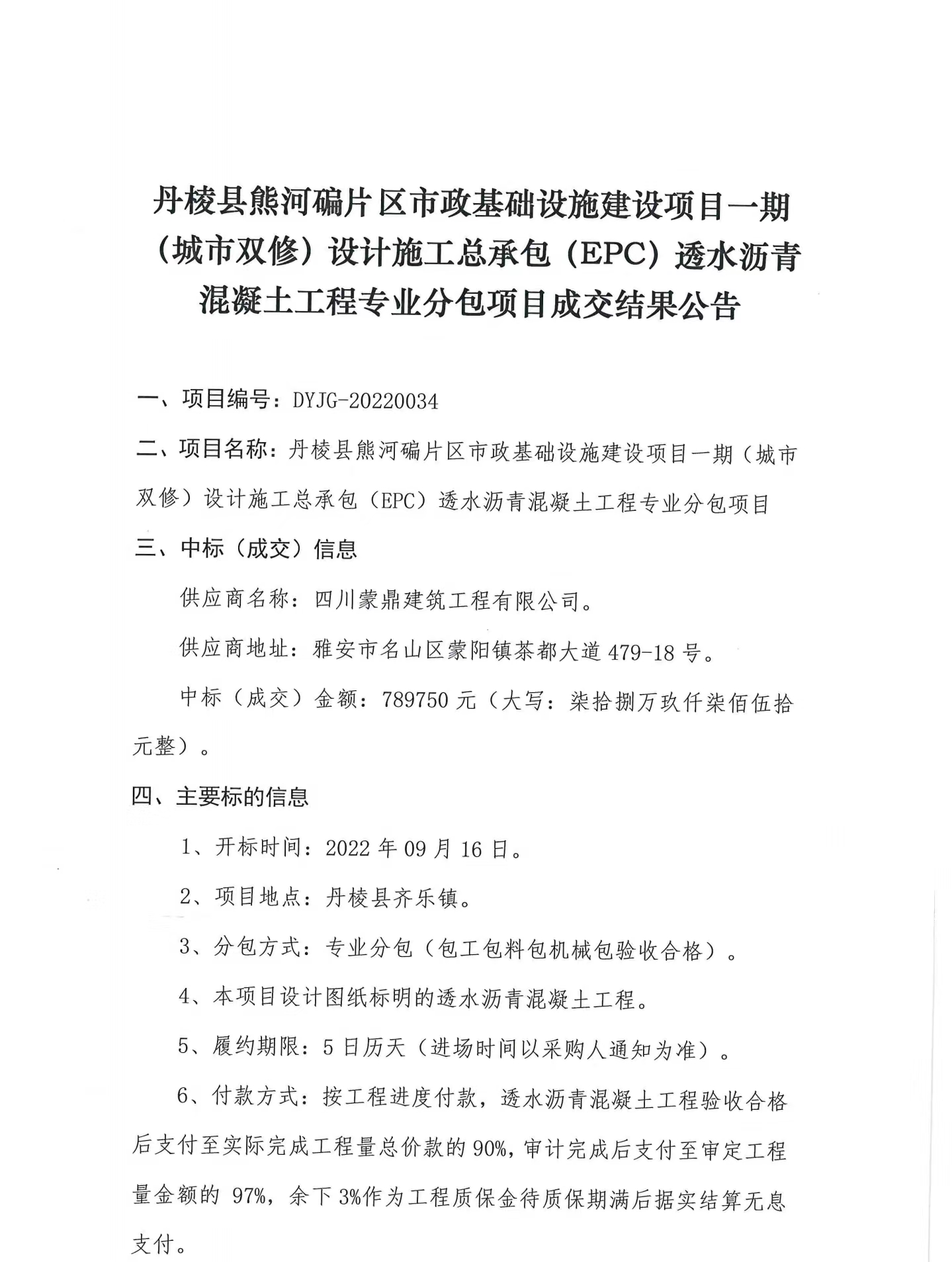 丹棱縣熊河碥片區(qū)市政基礎(chǔ)設(shè)施建設(shè)項(xiàng)目一期(城市雙修)設(shè)計(jì)施工總承包(EPC)透水瀝青混凝土工程專業(yè)分包項(xiàng)目成交結(jié)果公告