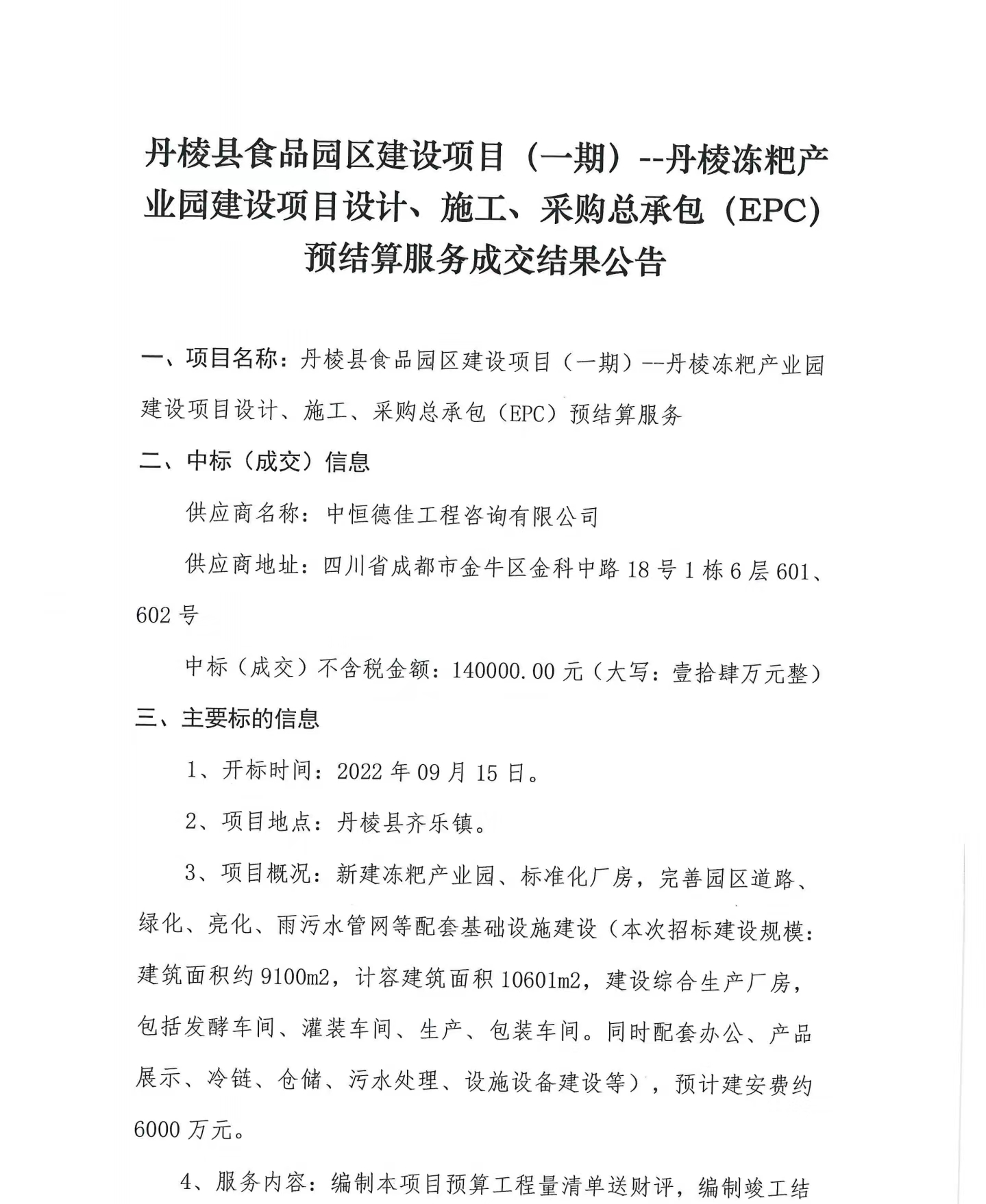 丹棱縣食品園區(qū)建設項目(一期)--丹棱凍粑產(chǎn)業(yè)園建設項目設計、施工、采購總承包(EPC)預結算服務成交結果公告