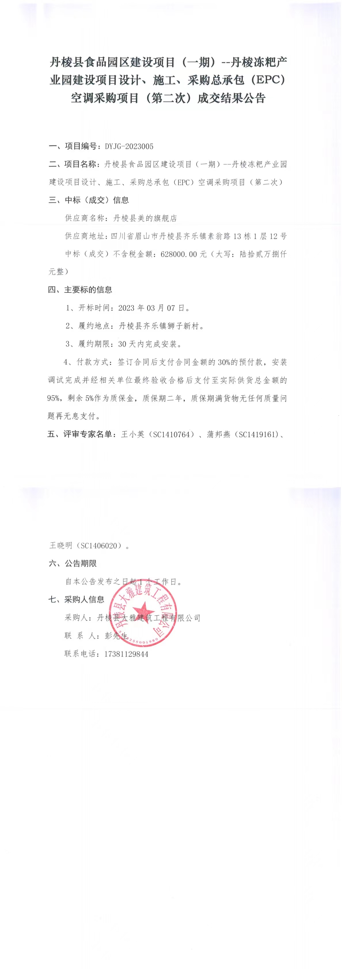 丹棱縣食品園區(qū)建設項目(一期)--丹棱凍粑產業(yè)園建設項目設計、施工、采購總承包(EPC)空調采購項目(第二次)成交結果公告