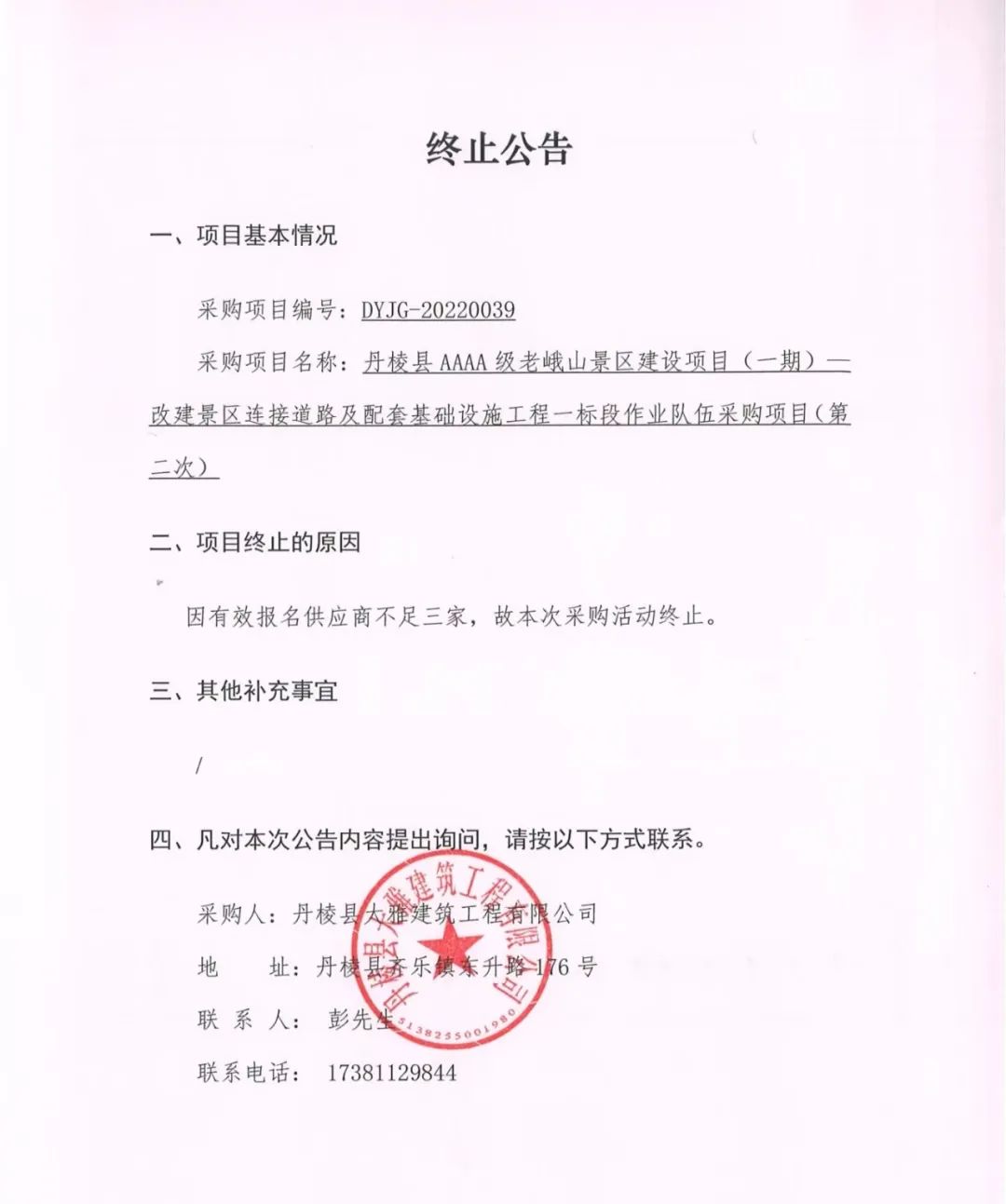 丹棱縣AAAA級老峨山景區(qū)建設(shè)項目(一期)--改建景區(qū)連接道路及配套基礎(chǔ)設(shè)施工程一標(biāo)段作業(yè)隊伍采購項目(第二次)終止公告