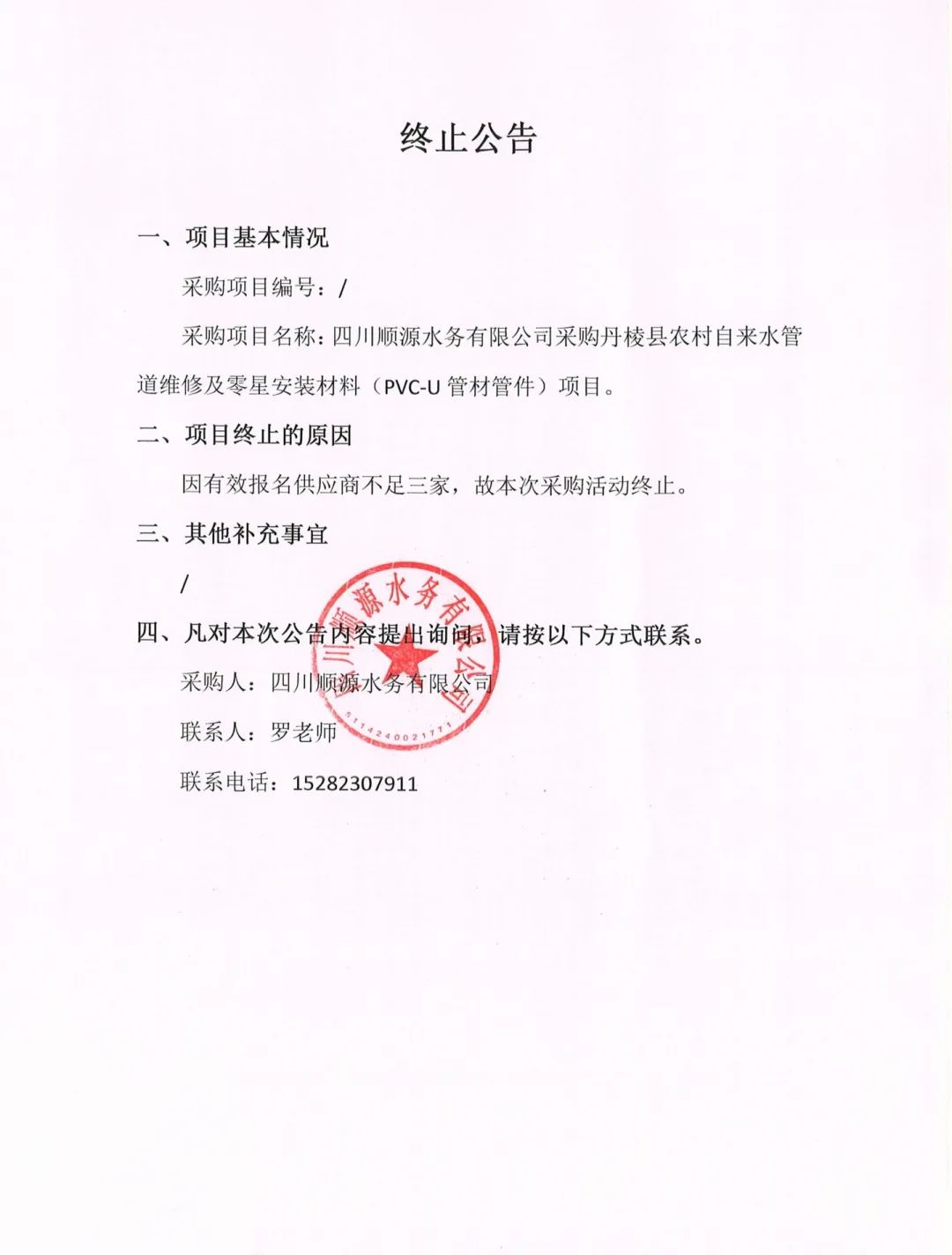 四川順源水務(wù)有限公司采購(gòu)丹棱縣農(nóng)村自來(lái)水管道維修及零星安裝材料(PVC-U管材管件)項(xiàng)目終止公告
