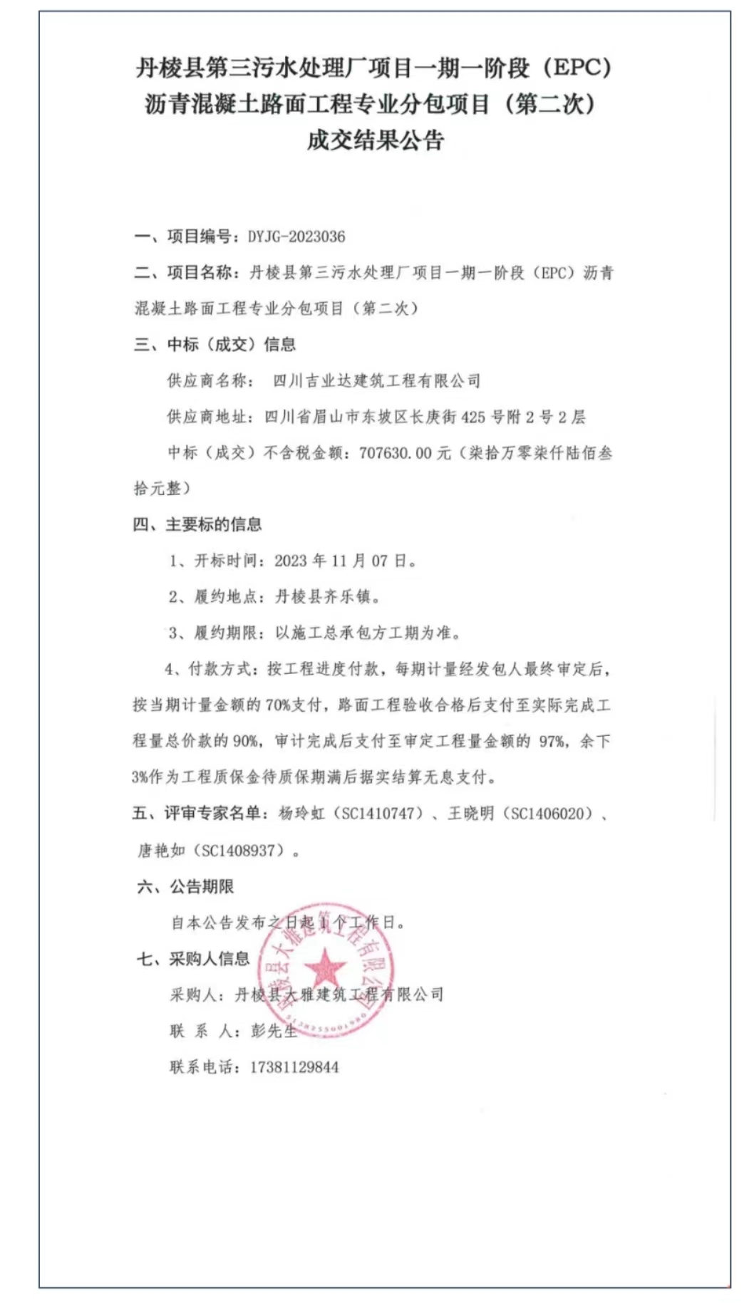 丹棱縣第三污水處理廠項(xiàng)目一期一階段(EPC)瀝青混凝土路面工程專業(yè)分包項(xiàng)目(第二次)成交結(jié)果公告