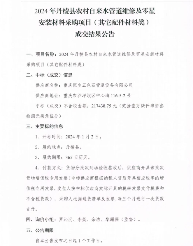2024年丹棱縣農(nóng)村自來(lái)水管道維修及零星安裝材料采購(gòu)項(xiàng)目 (其它配件材料類 )成交結(jié)果公告